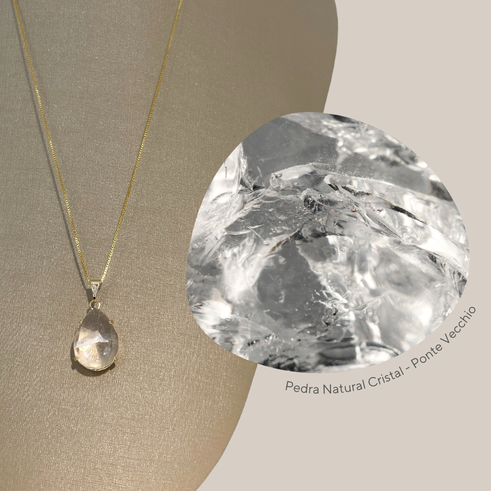 O pingente deste colar é uma verdadeira obra-prima da natureza. Moldado cuidadosamente em forma de gota, o cristal reflete uma miríade de cores, cada uma contando uma história. Sua translucidez e brilho são testemunhos da pureza e beleza intocada deste mineral.