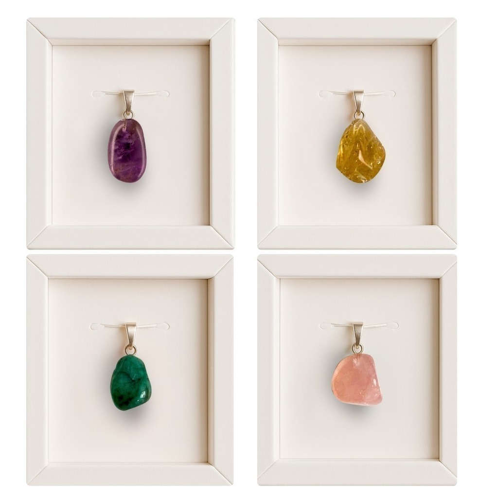 Este kit exclusivo reúne quatro pingentes com pedras naturais lapidadas, montados em prata 925, pensados para quem valoriza elegância, cor e autenticidade.